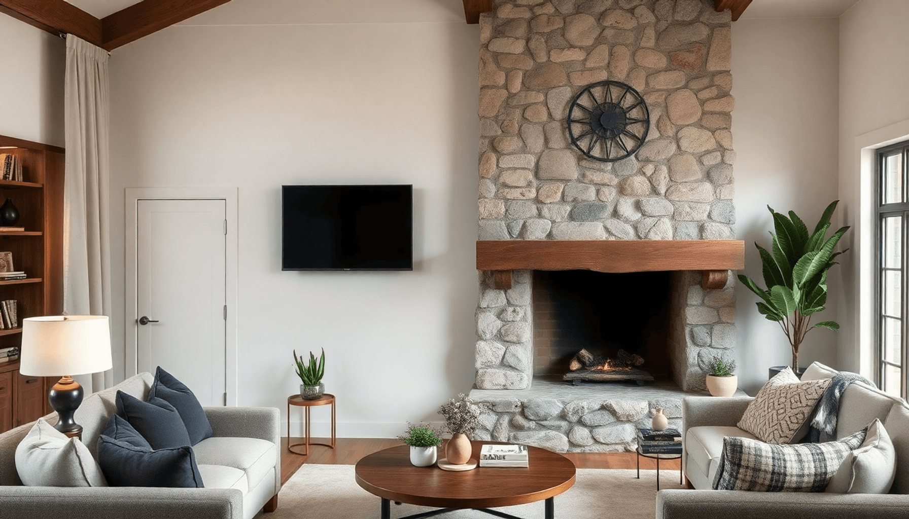 - Une cheminée intégrée au mur de briques pour créer un point focal chaleureux